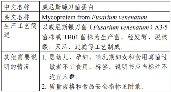 01 威尼斯镰刀菌蛋白等3 种新食品原料