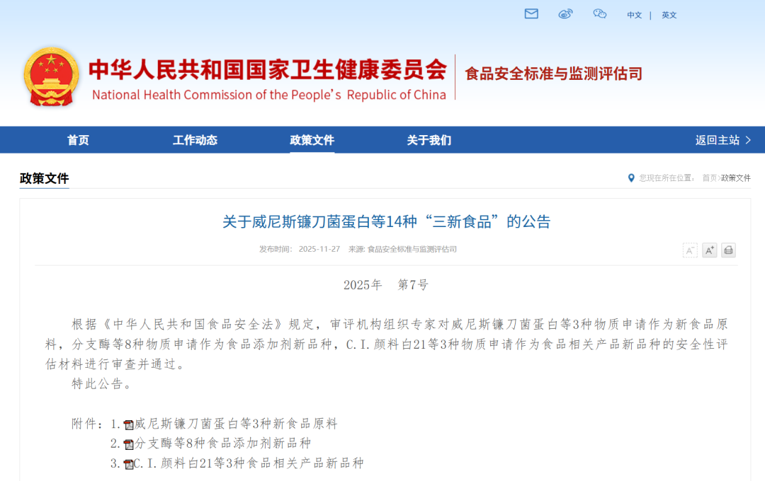 11月27日,卫健委食品安全标准与监测评估司发布2025年第7号公告,批准威尼斯镰刀菌蛋白、接骨木莓花色苷、油橄榄果多酚为新食品原料。
