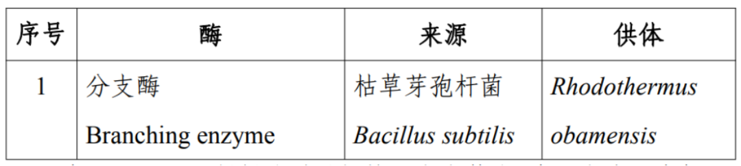本次发布公告的分支酶来源于枯草芽孢杆菌(Bacillus subtilis),作为食品工业用酶制剂新品种,主要用于增加淀粉的分支度,如在淀粉加工生产麦芽糊精过程中使用。