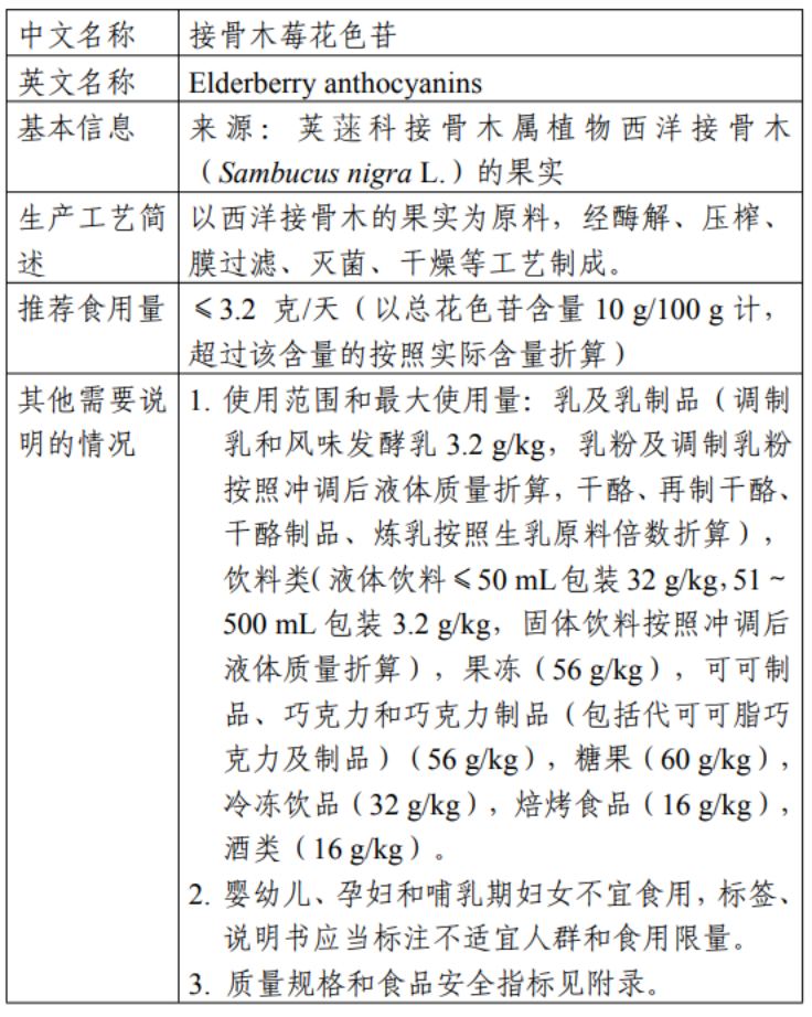 接骨木莓花色苷含有矢车菊素-3-O-葡萄糖苷等花色苷类物质,其推荐食用量≤3.2克/天(以总花色苷含量10 g/100 g计,超过该含量的按照实际含量折算)。