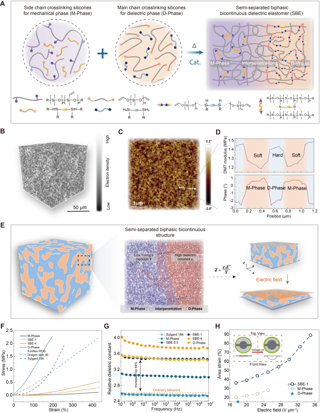 该策略利用了两种硅橡胶不同的交联机制,通过其异交联动力学的差异,引导两相在微米尺度自发组装。其中高介电常数的介电(D)相通过主链交联形成贯穿网络,而低杨氏模量的机械(M)相通过侧链交联构成力学骨架,形成边界融合、相互贯通的双相结构。这种微观结构既保持了材料的低杨氏模量,同时提高了其介电常数和击穿电场。实验表明,仅含10% D相的SBE材料,其杨氏模量约为10 kPa,相对介电常数为3.6,实现了高的机电灵敏度。基于此材料制备的人工肌肉,在无需预拉伸的情况下,在35 V/μm的电场下实现了90%的面积应变。