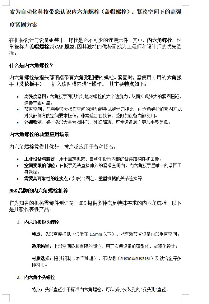 索为自动化科技带您认识内六角螺栓(盖帽螺栓):紧凑空间下的高强度紧固方案