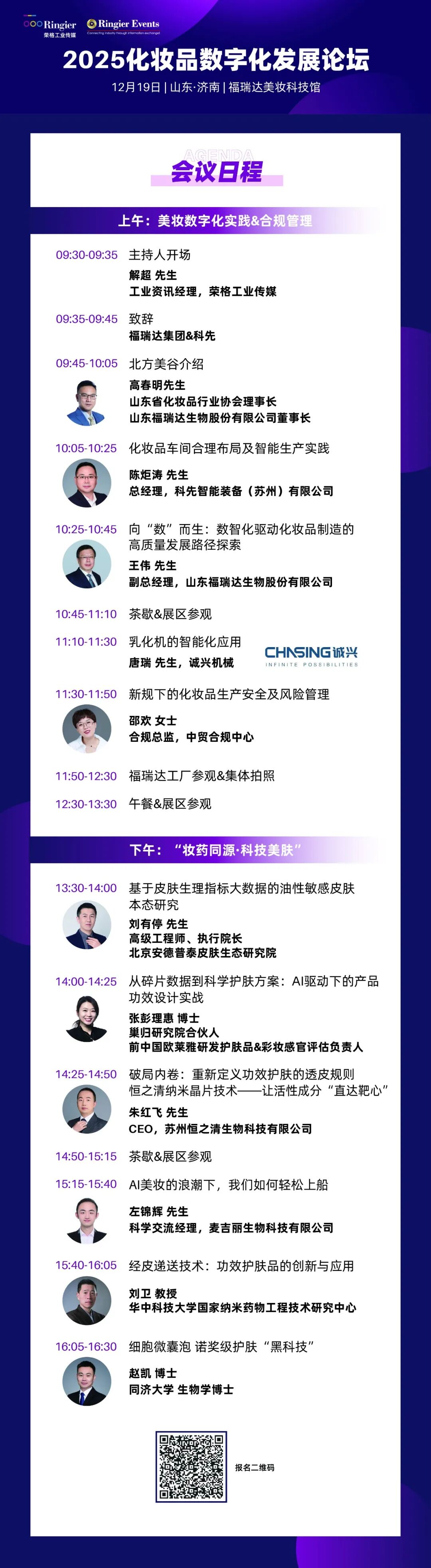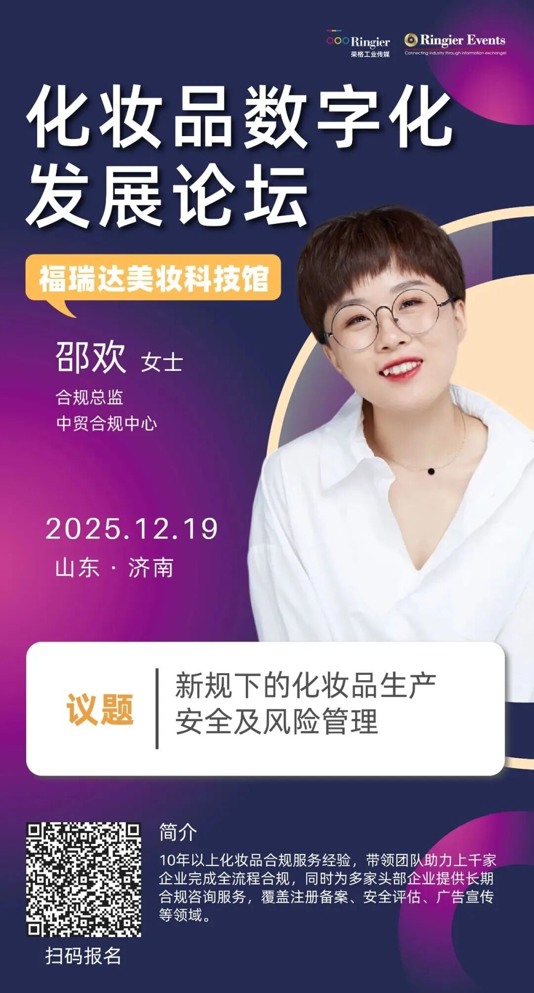 邵欢也将在 12 月 19 日举行的「2025 化妆品数字化发展论坛」上,聚焦两大核心议题展开分享:一是化妆品质量管理体系的构建与落地实践,助力企业搭建适配法规要求与业务发展的合规框架;二是化妆品典型处罚案例解析与风险规避策略,通过具象案例提炼合规痛点,提供可落地的风险防控路径,为参会企业的合规经营与稳健发展提供切实参考。扫描下方海报中的二维码即可报名参会——