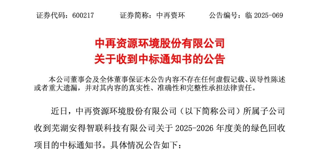 该公告表示,中标名称为2025-2026 年度美的绿色回收项目。中标人名称为中再生(绥化)电子废弃物循环利用有限公司、中再生(唐山)电子废弃物循环利用有限公司、 中再生 (临沂) 电子废弃物循环利用有限公司、 中再生(衢州)电子废弃物循环利用有限公司、中再生(洛阳)固体废弃物处置有限公司、 中再生(黄冈)固体废弃物处置有限公司、 中再生(南昌)电子废弃物循环利用有限公司、 中再生(内江)电子废弃物循环利用有限公司、中再生(昆明)固体废弃物处置有限公司、中再生(清远)固体废弃物处置有限公司。