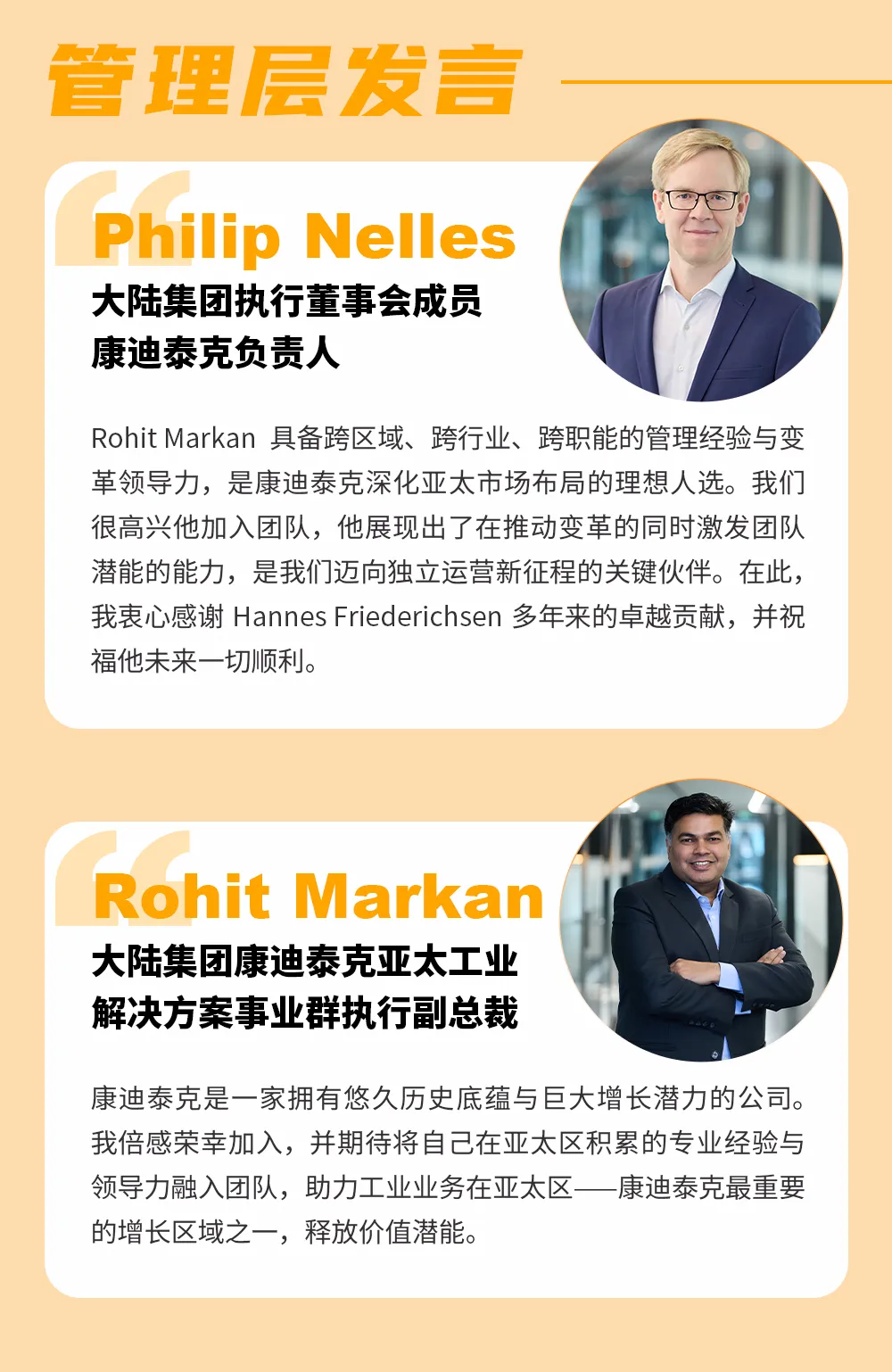康迪泰克宣布任命Rohit Markan为亚太区工业解决方案业务执行副总裁,常驻新加坡,全面负责中国、印度、日本、韩国等市场软管、输送带、传动带及空气弹簧等工业产品的战略与运营。