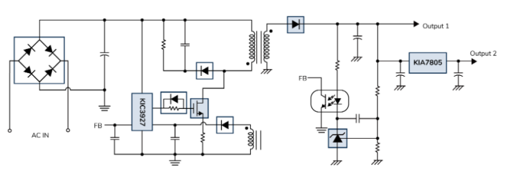 KIC3927是KEC旗下一款集成准谐振电流模式的PWM+PFM控制器,可用于非隔离反激式转换器,通过创新的多模式控制策略突破性能瓶颈。该方案提供三级输出:初级侧输出310V/0.5A用于电机驱动,次级侧输出12V/0.6A和5V/0.5A为MCU供电。