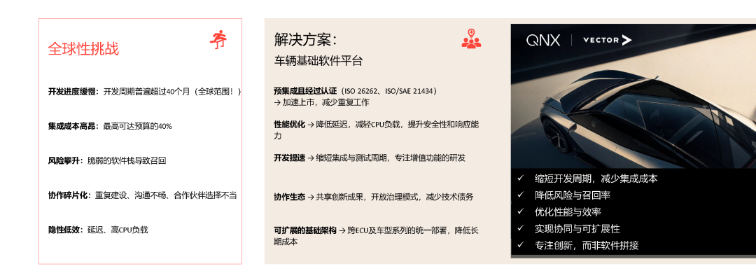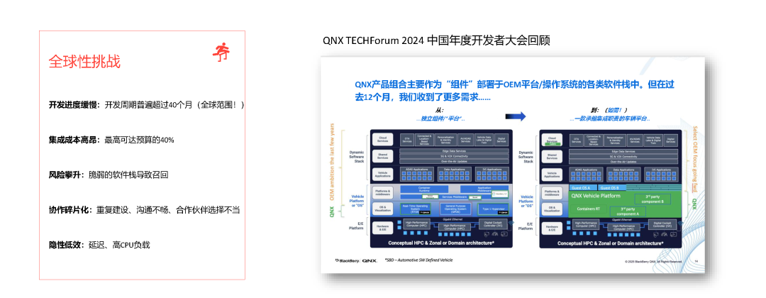 随着汽车电子电气架构的演进,软件复杂度大幅提升。QNX高级副总裁兼销售负责人John Moloney指出,行业正面临开发周期长、集成成本高、性能要求严苛等多重挑战。