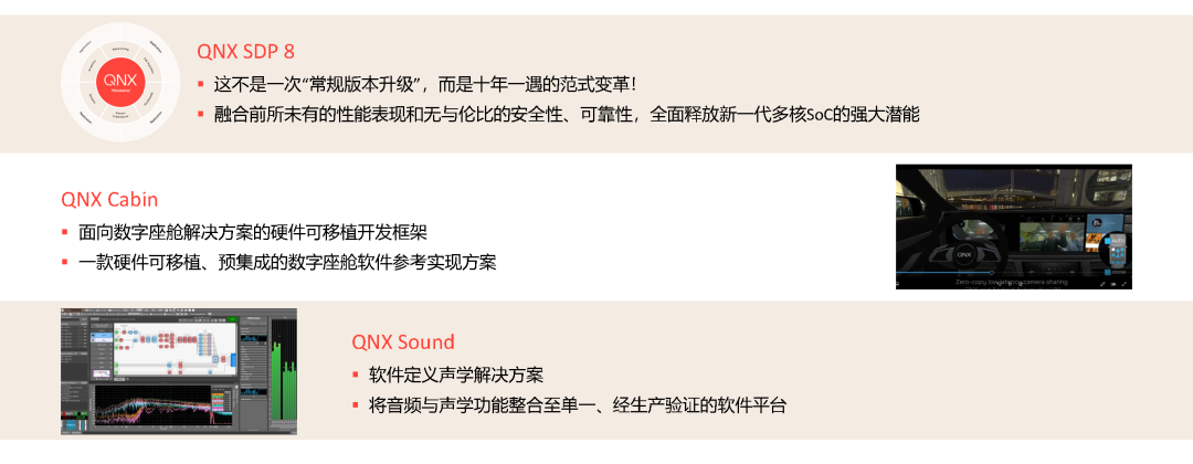 QNX Sound:一套完整的软件定义音频解决方案,支持开发者借助算法、框架与工具,打造完全由软件定义的座舱音频体验。这不仅让整车厂商无需额外投资专用硬件,也显著降低了硬件材料与软件开发两方面的成本。目前,该解决方案已获得中国领先本土车企豪华电动车型量产订单,正成为追求高性能沉浸式体验的汽车制造商的首选方案。
