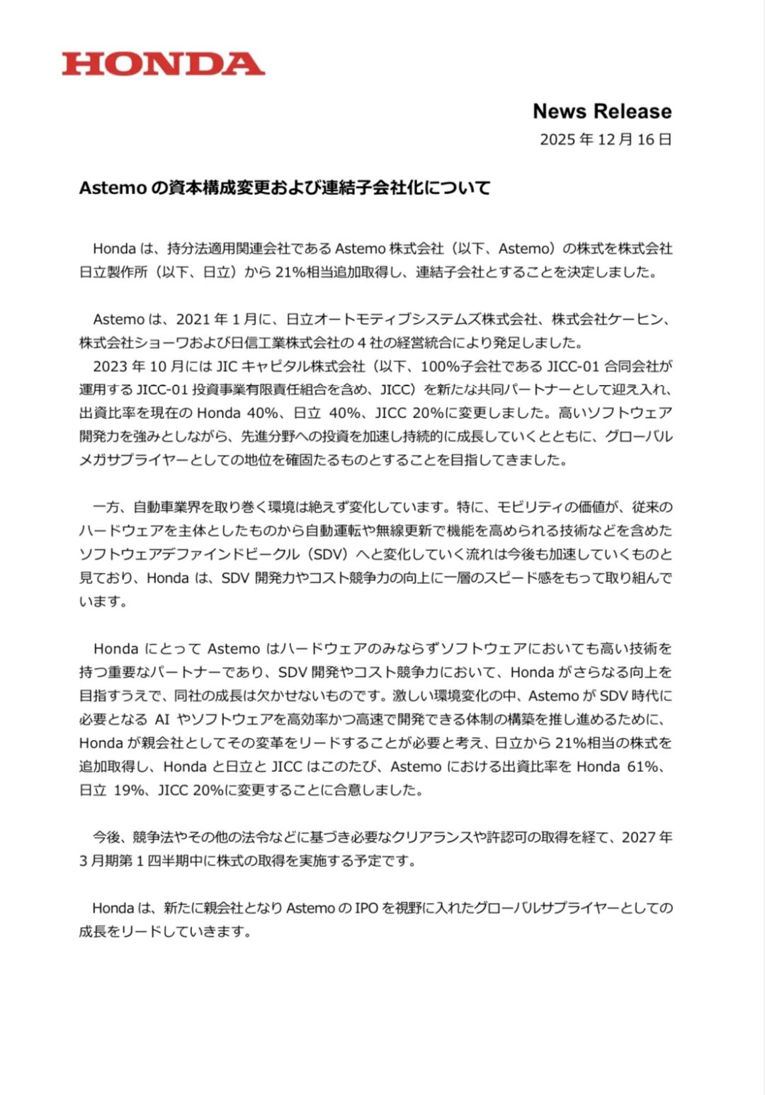 对本田而言,Astemo不仅是硬件,也是在软件领域拥有先进技术的重要伙伴;要实现SDV开发和成本竞争力的进一步提升,Astemo的成长不可或缺。在剧变的环境中,为使Astemo建立能够高效、高速开发SDV时代所需的AI与软件体系,本田认为有必要作为母公司引领其变革,因此与日立达成协议,追加收购21%股份,并将Astemo的出资比例调整为:本田61%、日立19%、JICC 20%。