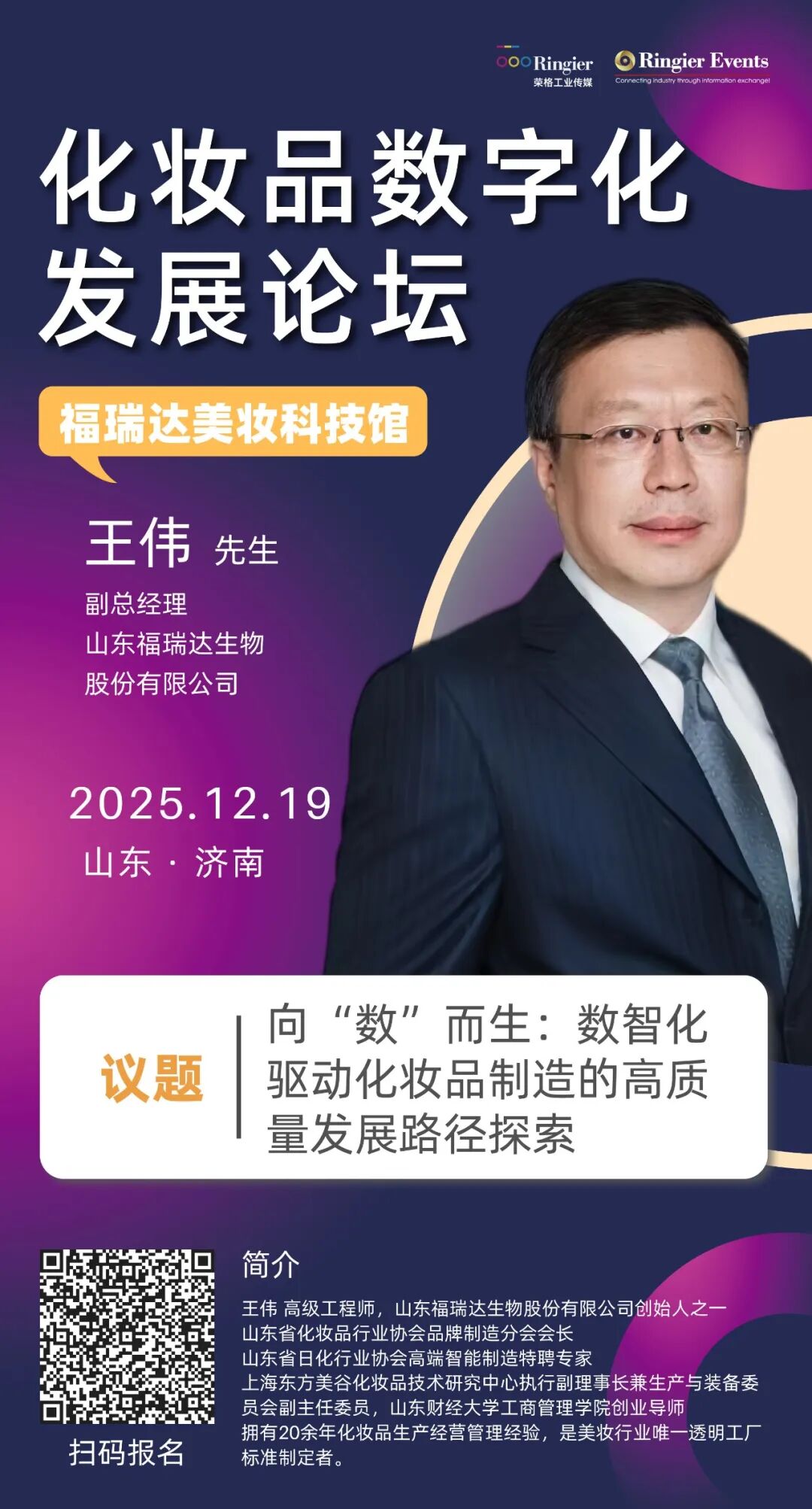 在即将于明天(12 月 19 日)举办的 2025 化妆品数字化发展论坛上,山东福瑞达生物股份有限公司的王伟先生将以《“向‘数’而生 : 数智化驱动化妆品制造的高质量发展路径探索》为题,和与会者分享福瑞达如何用数据打通前后端,让市场变化实时驱动生产体系的灵活、精准调整的实践——