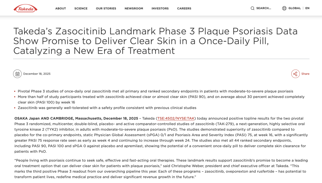 昨日,2025 年 12 月 18 日,武田制药宣布其口服银屑病药物 zasocitinib 在三期临床试验中达到主要终点。该款每日一次的小分子药物,在中重度斑块型银屑病患者中展现出显著的皮肤清除效果,优于安慰剂和现有疗法 apremilast。武田计划于 2026 财年开始向美国 FDA 及其他监管机构提交上市申请……