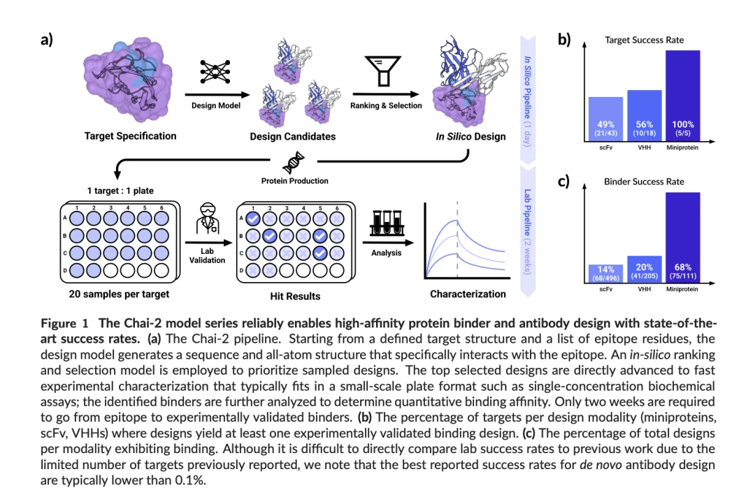 Chai Discovery 的核心产品是其生成式 AI 平台 Chai-2。该平台采用「零样本」(zero-shot)设计模式,能够仅根据目标靶点信息从零开始生成全新的抗体序列,无需依赖已知样本或大规模筛选。该公司声称,这种方法在抗体设计中实现了两位数的实验成功率,比此前的计算方法提高了 100 倍。