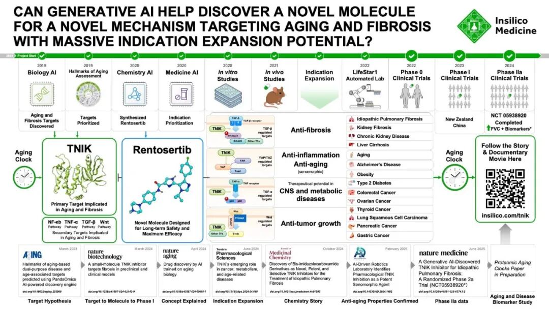Insilico 的 Pharma.AI 平台覆盖靶点识别、小分子生成和临床结果预测。其内部管线聚焦纤维化和抗衰老领域。该公司的领先候选药物 rentosertib(原代号 ISM001-055)是一款潜在的 first-in-class TNIK 抑制剂,已在中国完成一项 71 人参与的 IPF 二期 a 临床试验,结果显示肺功能有所改善,相关数据于 2025 年 6 月发表在《Nature Medicine》上。