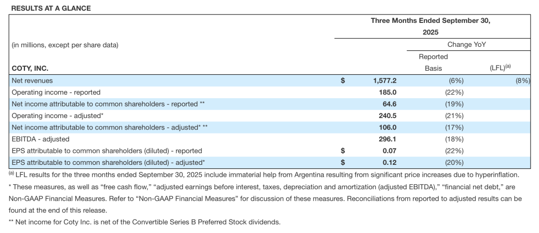 在 2026 财年第一季度(截至 2025 年 9 月 30 日),科蒂销售额同比下降 6% 至 15.77 亿美元,调整后 EBITDA 同比下降 18%,毛利率从 65.5% 降至 64.5%。高端业务销售额下降 4%,大众消费美妆业务销售额下降 9%。