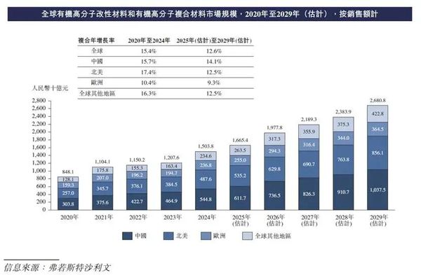 下游终端对改性材料的应用和加工逐渐熟悉,改性材料的应用快速增长,远超高分子材料市场增速,全球有机高分子改性材料和有机高分子复合材料市场规模从2020年的人民币8,481亿元迅速增长至2024年的人民币15,038亿元,复合年增长率为15.4%。有机高分子改性材料的强度高和重量轻等特性使其应用范围更为广泛。预计2025年至2029年,市场将以复合年增长率12.6%平稳增长,至2029年达人民币26,808亿元。