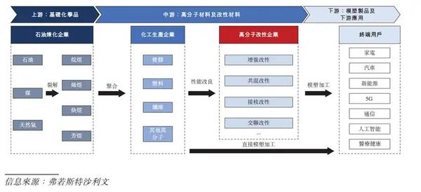 行业上游主要为通用级塑料生产企业,随着近年来大型民营炼化窗口的开放,中国民营炼化产能高速扩张,带动了通用级塑料产能的快速发展。但是,当前中国通用牌号塑料仍然面临缺乏专利、整体质量不稳定的问题,所以往往依赖中游企业的改性工艺以满足其物理和化学使用需求。