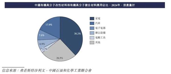 从中国有机高分子改性材料和有机高分子复合材料的应用占比来看,2024年,得益于有机高分子改性材料和有机高分子复合材料的高适用性,迭加家电行业的强劲需求和消费环境,家电行业对其使用的贡献最高,占约38.2%,而受益于汽车市场的快速增长和轻量化的需求,有机高分子改性材料和有机高分子复合材料中17.9%应用于汽车行业。