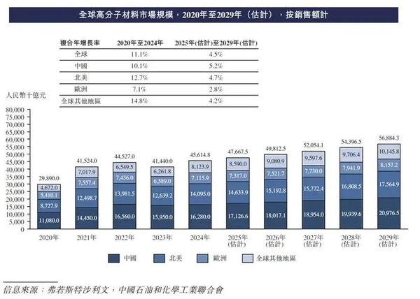 全球高分子材料市场规模从2020年的人民币298,900亿元迅速增长至2024年的人民币456,148亿元,2021年后,随着全球经济整体性复苏,全球高分子材料市场有着较大幅度的增长,综合2020年至2024年的复合年增长率为11.1%。