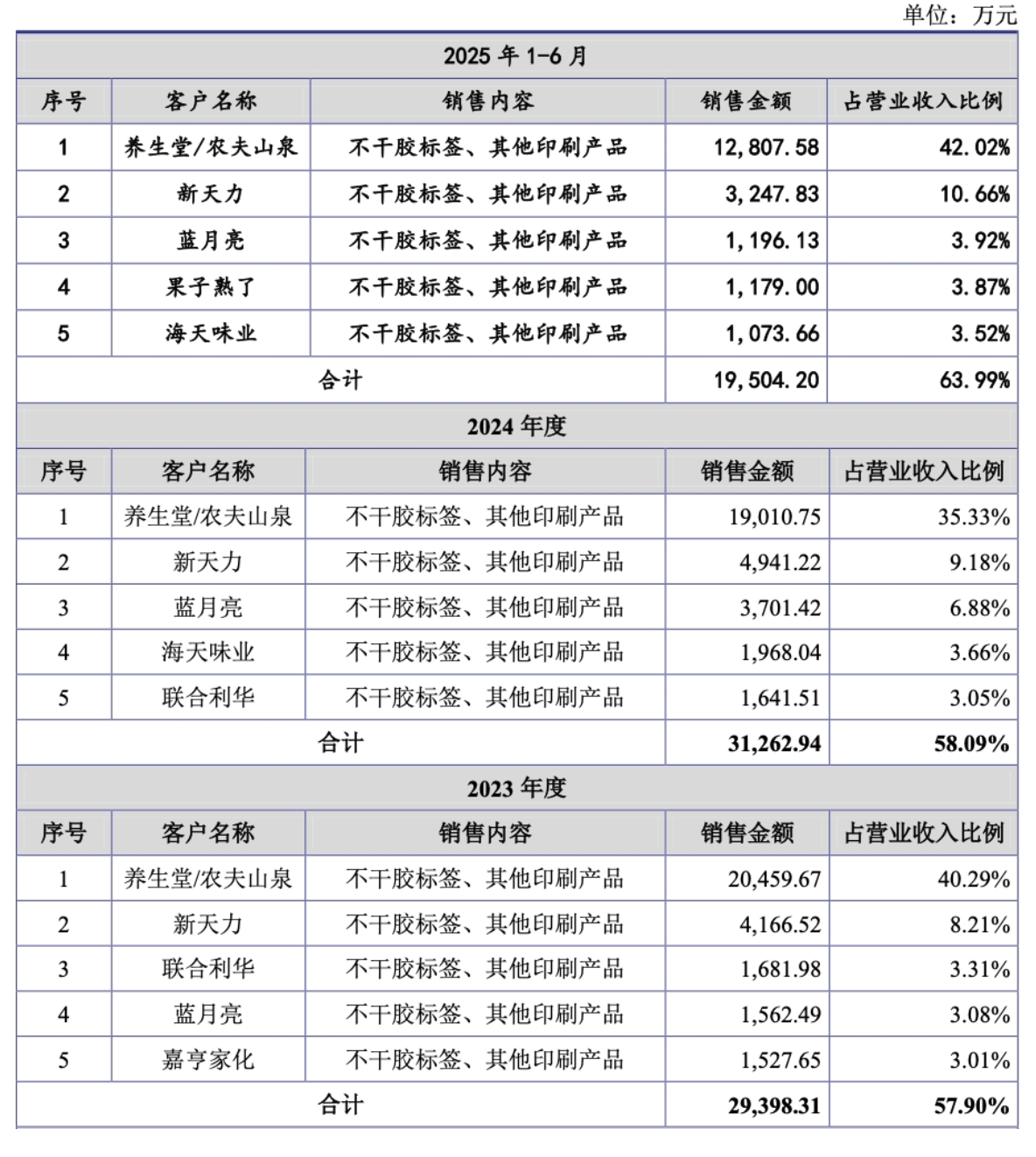 招股书披露,2022 年至 2025 年上半年,养生堂及其控股的农夫山泉始终位列其第一大客户,销售金额分别为 1.13 亿元、2.05 亿元、1.90 亿元、1.28 亿元,占营收比例从 29.40% 攀升至 42.02%。