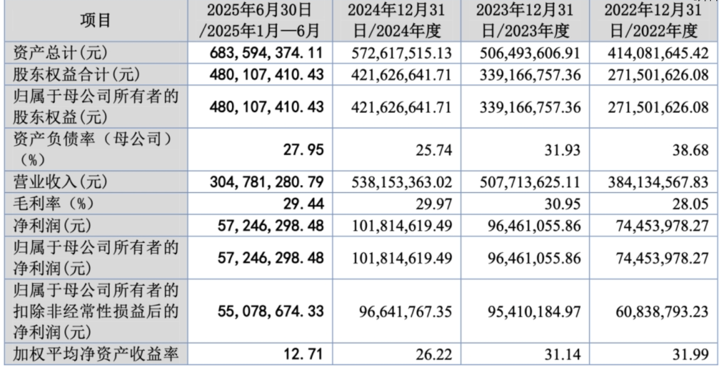 盈利质量方面存在隐忧。招股书显示,综合毛利率从 2023 年的 30.95% 下滑至 2024 年的 29.97%,2025 年上半年进一步降至 29.44%。薄膜类不干胶标签单价也呈现下滑趋势,从 2022 年的 7.98 元/平方米降至 2025 年上半年的 5.84 元/平方米。
