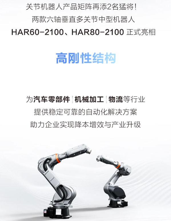 作为通用型中型机器人,HAR60-2100 与 HAR80-2100 凭借强适配性,已实现汽车零部件、机械加工、物流等行业的核心场景覆盖: