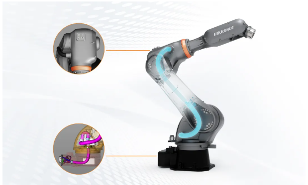 本体内置2路气路与19路信号线,并额外集成网络线缆,降低外部干涉风险,让机器人在狭窄空间内也能灵活运转,便于客户集成部署,减少干涉,进一步提升产线空间利用率。