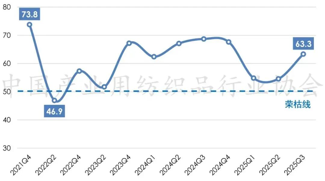 面对复杂严峻的外部环境,我国产业用纺织品行业经济运行总体保持平稳,行业的生产、经济效益指标增速有所放缓,出口呈现温和回暖趋势。根据中国产业用纺织品行业协会调研,2025年前三季度我国产业用纺织品行业景气指数为63.3,较上半年提升8.7个点(图1)。