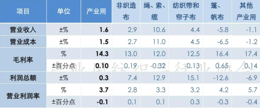 纺织带和帘子布规模以上企业的营业收入和利润总额分别同比增长4.4%和15.1%,利润总额增速位居行业首位,营业利润率为3.2%,同比增长0.3个百分点;