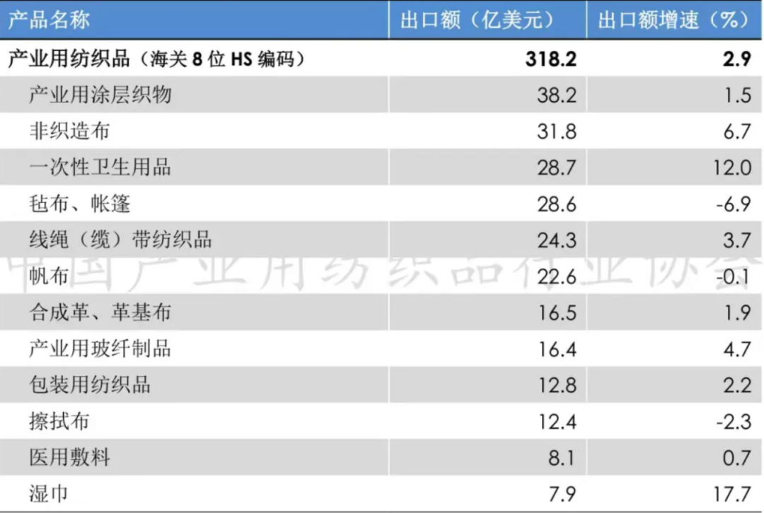 表2:2025年1-9月我国产业用纺织品行业及主要产品出口情况,数据来源:中国海关,中国产业用纺织品行业协会