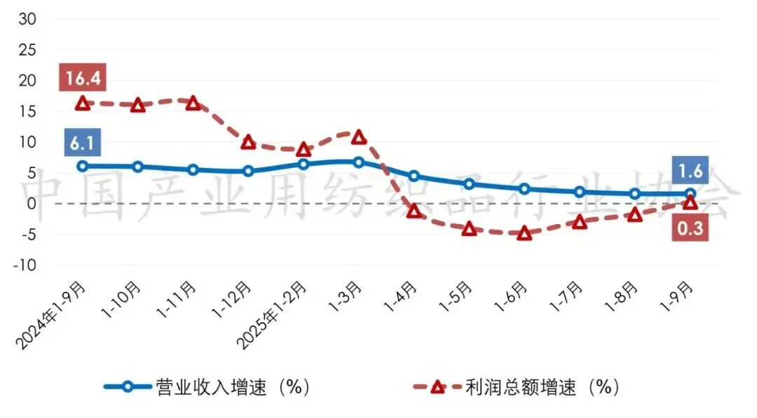 根据国家统计局数据,2025年前三季度产业用纺织品行业规模以上企业的营业收入和利润总额分别同比增长1.6%和0.3%;根据中国产业用纺织品行业协会测算,行业规模以上企业的营业利润率为3.7%,同比下降0.1个百分点;行业亏损面为24.2%,较二季度收窄2.6个百分点。