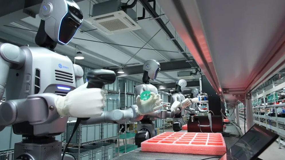 在越疆科技的车间内,机械臂正在蓝光指引下精准作业。一旁的大屏幕上,实时呈现越疆“超级工厂”训练场的动态:机械臂、人形机器人与多足机器狗协同工作——这幅多形态机器人协同运作的场景,正是深企具身智能平台化方案的现实缩影。