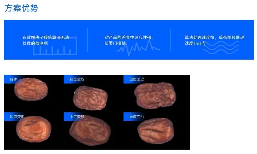 阿丘科技自主研发的工业AI视觉算法平台软件AIDI,为破解这一难题提供了高效方案。采用基于AIDI的分割算法可检测对比度低的斑点、凹陷、裂痕等缺陷类型,效果优于传统算法,且能快速建立模型;它还能依据客户需求,对蔬果进行细致分类定级,设定不同等级标准。以大枣分选为例,AI算法能轻松识别皱皮、变形等传统方法难以检测的缺陷,极大提升了分选的质量与效率。