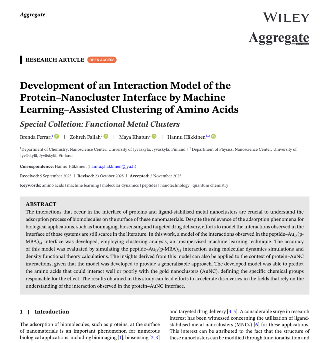 他们利用机器学习构建了一套计算模型,成功破译了配体保护金纳米簇(Gold Nanoclusters,AuNCs)与蛋白质相互作用的化学规则,为生物成像和靶向给药提供了新参考思路。