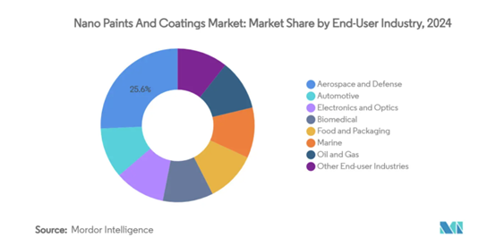 纳米涂料的应用已纳米涂料的应用已从传统的防腐、装饰领域,向高附加值的功能化市场快速拓展,形成多元化的终端市场格局。其主要应用领域涵盖医疗、食品包装、航空航天、海洋工程、电子产品、汽车制造以及石油天然气等关键行业。其中,建筑行业的需求产生变化,由于城市化进程加速和污染问题凸显,在全球城市化及存量建筑改造升级的背景下,建筑活动仍然有所增加。纳米涂料因其能有效抵御潮湿、污染物和紫外线等极端环境,显著延长建筑材料寿命,同时提供更佳的外观效果,而在现代建筑中被广泛采用。自清洁、防涂鸦、隔热和抗菌等功能型涂料正成为新建筑和改造项目的标配。