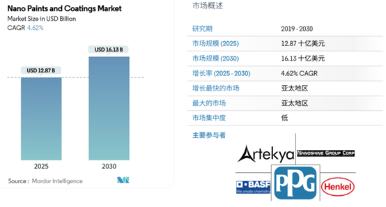 Mordor intelligence在近期发布的研究中报告了,全球纳米涂料与涂层市场规模在2025年估计为128.7亿美元,预计到2030年将达到161.3亿美元,在预测期(2025-2030年)内的复合年增长率为4.62%。