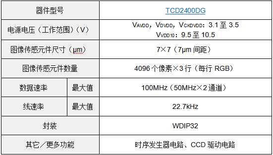 TCD2400DG是一款彩色CCD线性图像传感器,拥有三行图像阵列,每行4096个像素,像素间距为7μm。每一行分别独立识别红、绿、蓝(RGB)。其线速率(即每秒采集的行数)为22.7kHz,高于东芝目前用于图像检测设备的TCD2564DG(10.5kHz)。