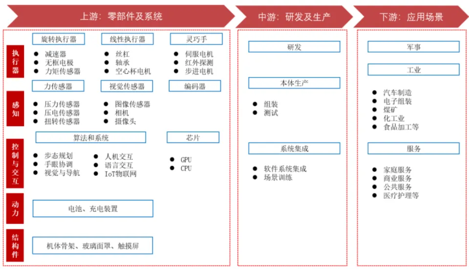 吕子炜分析认为,当前人形机器人的产业链可分为上游核心零部件及系统提供商、中游研发及整机制造生产商以及下游应用场景提供商三部分。