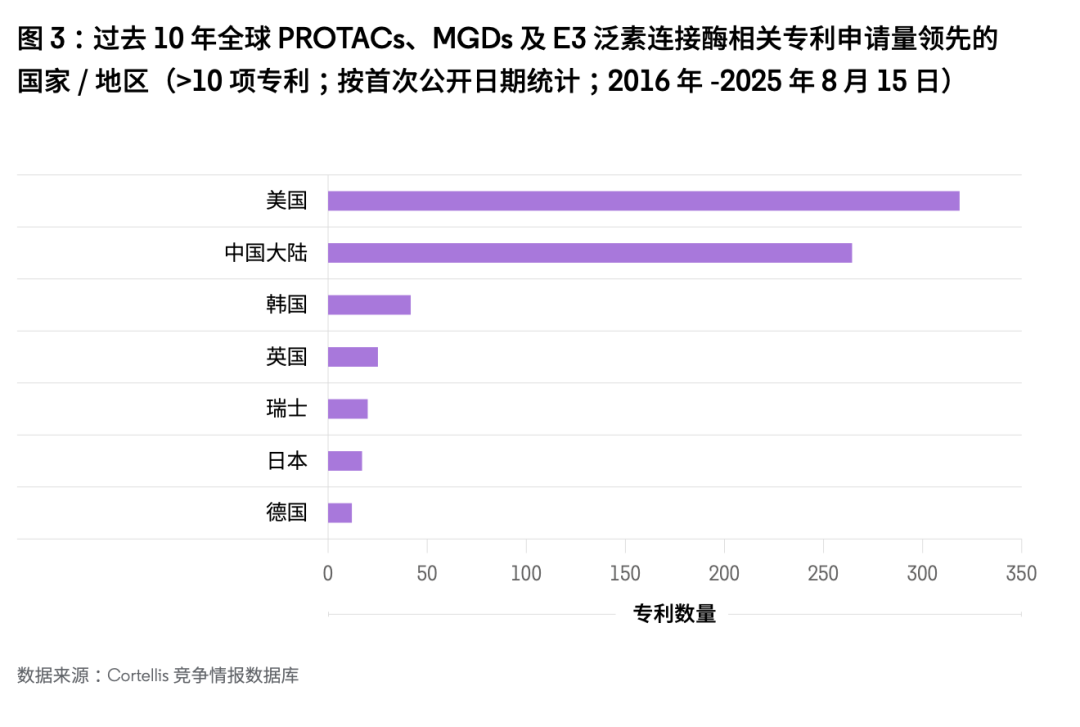 根据科睿唯安旗下的综合性生命科学情报数据库 Cortellis 数据,过去 10 年间,全球范围内针对 PROTACs、MGDs 及 E3 泛素连接酶相关专利共计 717 项,其中美国机构申请 319 项(占比 44.5%),中国机构申请 265 项(占比 37%),位列全球第二。