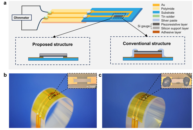 创新结构设计:采用 5μm 超薄单晶硅应变片( piezoresistive 层 150nm)作为传感核心,搭配 5μm 高韧性聚酰亚胺(PI)基板,通过水蒸气等离子体辅助(WVPA)键合技术实现 Au-Au 直接连接,无粘合剂和导电浆料,避免粘弹性带来的信号漂移;