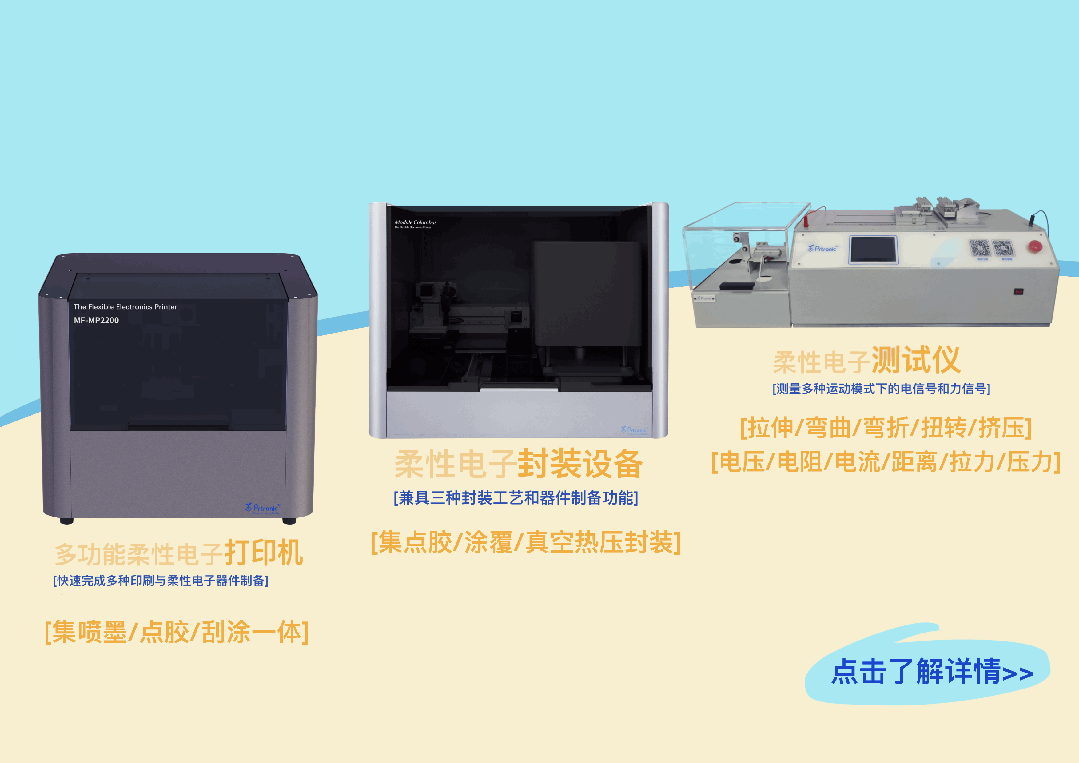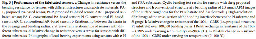核心:展示传感器分层结构(Si 应变片 + PI 基板 + Au 布线),及 PA、PI、AR 三种基板的柔性验证(可贴合 1mm 半径圆柱);