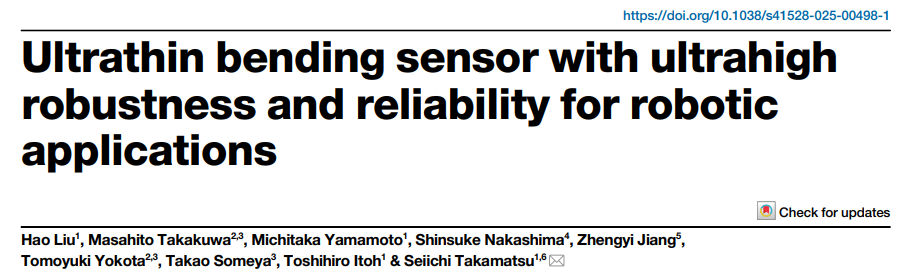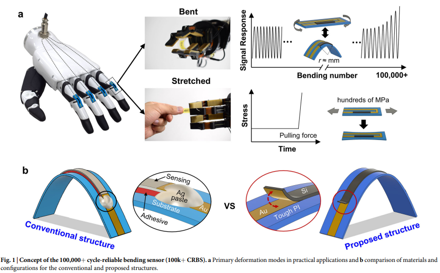 东京大学团队开发的 “10 万 + 循环耐用弯曲传感器(100k+ CRBS)”,通过超薄 Si 应变片、WVPA 直接键合技术与 PI 基板的协同设计,解决了传统传感器寿命短、信号漂移的痛点,实现高弹性、高线性度和强环境适应性,为机器人精准感知与人机交互提供可靠方案。