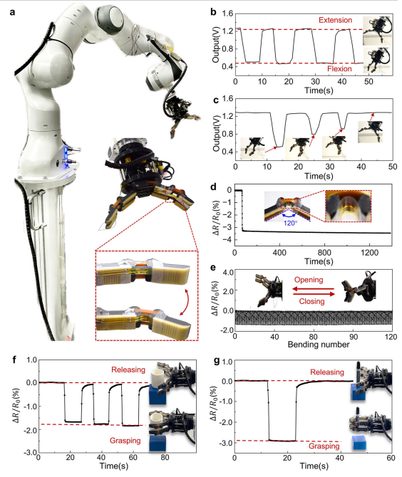 关键:展示实际应用场景 ——① 120° 弯曲保持 20 分钟信号无漂移;② 120 + 次开合循环信号稳定;③ 成功抓取不同尺寸物体(杯子、马克笔),为机械臂精准控制提供反馈。