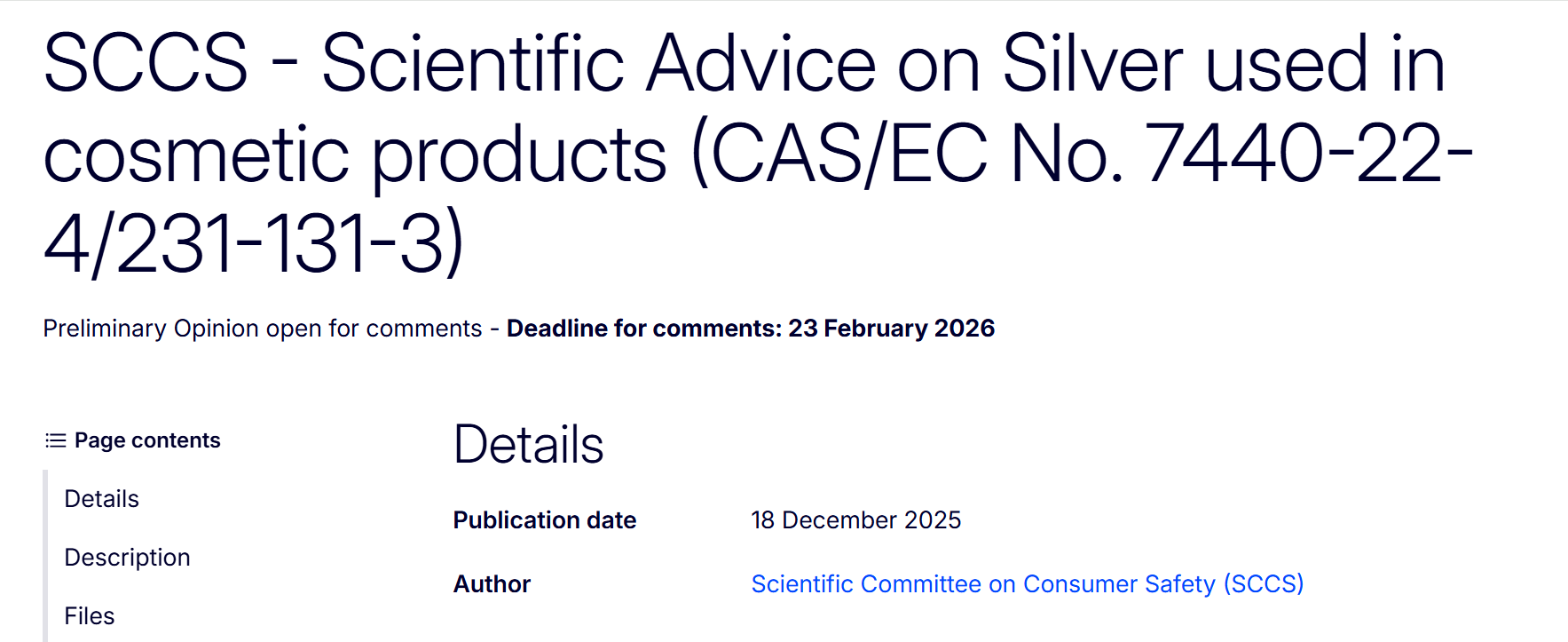 2025年12月18日,欧盟消费者安全科学委员会(SCCS)发布了银(CAS号7440-22-4)在化妆品中使用的初步科学意见(SCCS/1687/25),公开征求意见将于2026年2月23日截止。