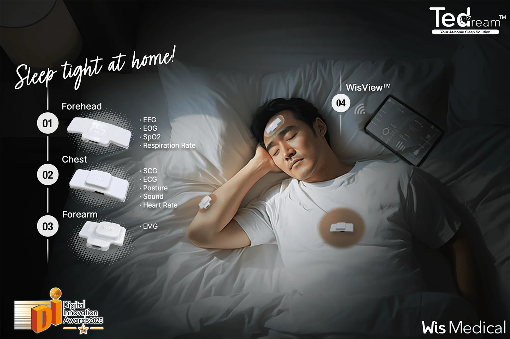 韩国企业 Wis Medical 发布的 Tedream 获得无障碍与长寿类别创新奖荣誉提名,这是一款无线软贴片系统,可在家中复制完整的睡眠实验室研究。该系统同时测量脑电图(EEG)、心电图(ECG)、肌电图(EMG)、血氧饱和度(SpO₂)、心率、呼吸频率、打鼾与体位,采用无凝胶、皮肤友好型设计。无粘合剂贴片舒适地附着于前额、胸部与前臂,提供远超手腕式追踪器的医疗级信号保真度。Tedream 通过无线方式将数据传输至智能手机进行实时可视化与云端分析,实现准确的居家睡眠呼吸暂停测试。Qi 无线充电与可重复使用设计使其适合多夜使用,具有成本效益且用户友好。