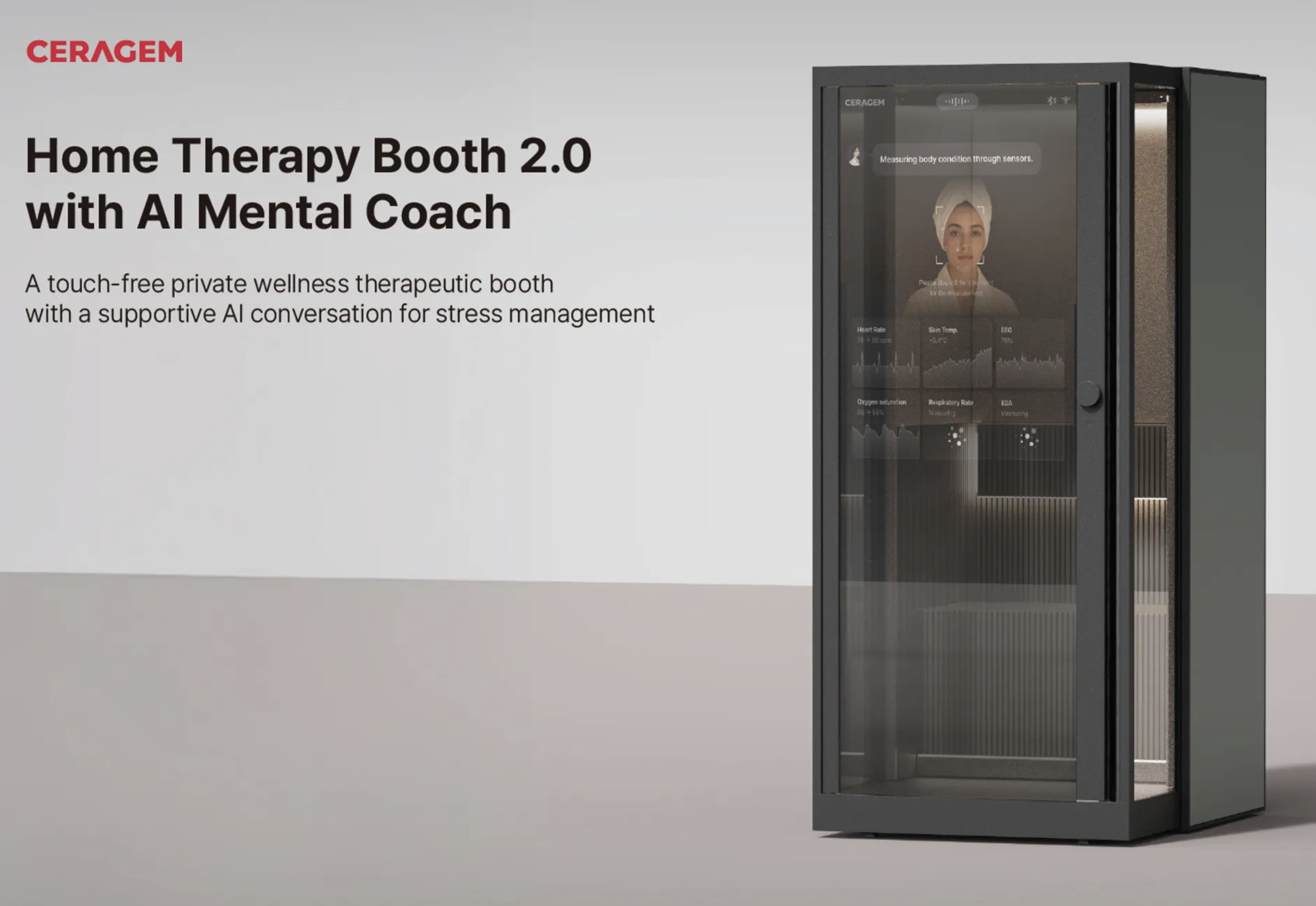 Home Therapy Booth 2.0 with AI Mental Coach(配备人工智能心理教练的家庭治疗台 2.0)获得 AI 与智能家居类别创新奖荣誉提名,这是一款私密的单人健康舱,用于家庭疗愈。进入前,多模态计算机视觉与传感(雷达微动、rPPG、热成像)识别用户并估算呼吸、心率与皮肤温度,然后添加时间、天气与睡眠质量等情境信息。边缘 NPU 运行神经模型进行身份识别、情感推断与会话规划,原始生物特征数据从不离开设备。舱内系统调节加热或冷却、氧气、光线、声音、香氛与生成式视觉冥想,每隔几秒自动适应以保持用户处于恢复性范围。与 AI 心理教练的自然语言对话提供压力支持与指导,完全隐私。语音与手势使操作免触控,自动调整界面适应身高与姿势。