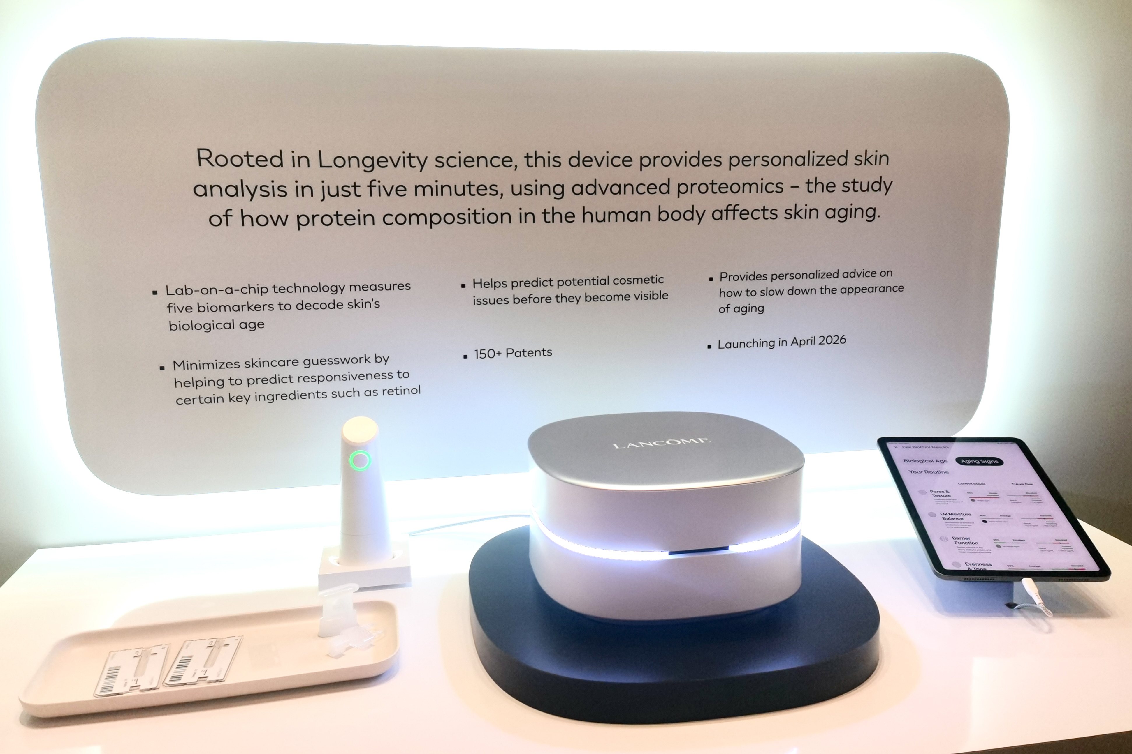 欧莱雅集团在去年 CES 2025 首发的 Cell BioPrint 皮肤分析设备在本届展会上以 Lancôme(兰蔻)品牌版本亮相,并宣布将于 2026 年 4 月正式上市。这是欧莱雅集团将「长寿科学」(Longevity Science)理念转化为消费级产品的重要一步。