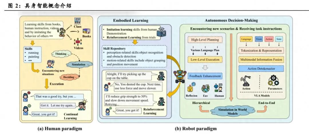 具身智能的实现依赖于“大脑”与“身体”的双轨突破。在“大脑”层面,大模型 (如 GPT、多模态模型)通过海量数据训练,具备跨模态理解、知识迁移和上下文学习 能力,能够将自然语言指令转化为具体行动策略。例如,当用户说“递给我桌上的苹果”, 大模型需解析“苹果”的视觉特征、“递”的空间关系,并规划抓取路径。在“身体” 层面,硬件技术需突破运动控制、环境适应等瓶颈,如一体化关节、柔性材料、高精度 传感器等。两者的结合使机器人从“预设程序工具”升级为“自主学习体”,例如通过 强化学习在虚拟环境中模拟任务,再将经验迁移至真实世界。 人形机器人因其形态与人类的高度相似性,成为具身智能实现通用能力的首选形态。 首先,人形结构具备跨场景适应性。人类的双足行走、双臂协作等能力可应对复杂地形 和多样化任务,例如工厂装配、家庭服务、灾害救援等。相比之下,四足机器人或机械 臂的功能局限于特定场景。其次,人形机器人能复刻人类认知机制。儿童通过触摸、试 错学习认知世界,而人形机器人可通过触觉、视觉反馈理解物体属性(如硬度、重量), 甚至模拟情感交互。例如,优必选科技的人形机器人已能通过手势识别与人类自然对话。 最后,人形机器人是技术进化的必然方向。其硬件设计(如全身动力学控制)与软件算 法(如模仿学习)的协同优化,为通用人工智能(AGI)提供了物理载体。