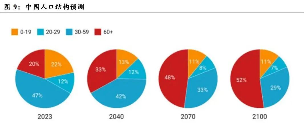 我国老年人口规模庞大,且尚处于高速增长态势。我国自 2000 年迈入老龄化社会之 后,人口老龄化程度持续加深。根据民政部、全国老龄办发布的《2023 年度国家老龄事 业发展公报》,2023 年中国 60 岁及以上人口 29697 万人,占全国人口的 21.1%。根据联 合国 2024 年人口展望测算,如果出生率等大背景没有明显改变,中国 60 岁以上人口在 2040 年就会达到 33%,到 2070 年则会达到 48%,而 30-59 岁的青壮年人口则会从 2023年的 47%下降至 2040 年的 42%,到 2070 年则会进一步下降至 33%。届时会出现明显的 劳动人口短缺及老年人养护问题。