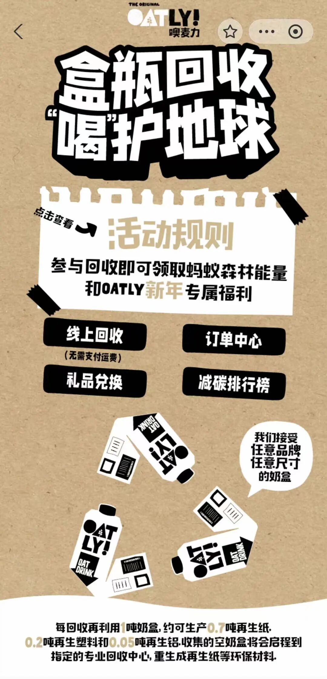 品牌联合回收,即与消费品品牌合作,针对其产品或特定旧物发起专项回收活动。例如,近期与瑞典燕麦植物蛋白品牌OATLY(噢麦力)携手发起的“盒瓶回收,‘喝’护地球”回收计划,用户回收任意品牌、任意尺寸的废弃奶盒,不仅能获得蚂蚁森林能量,还可兑换OATLY提供的专属福利。“这种模式实现了多赢:消费者获得激励,品牌强化环保形象,我们则拓展了品类与用户粘性。”任恺说道。
