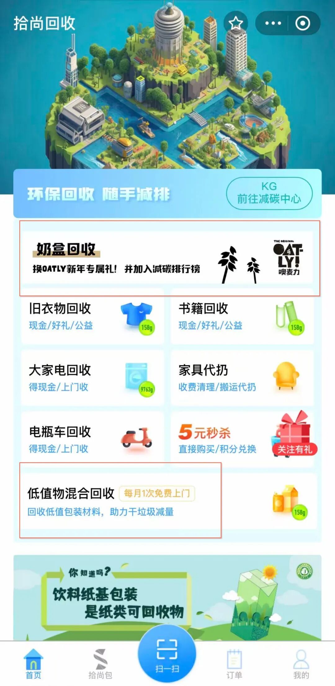 “拾尚回收”在覆盖旧衣物回收、书籍回收、大家电回收、家具代扔、电瓶车回收等常规品类外,重点拓展了两大方向——品牌联合回收和低值物混合回收。